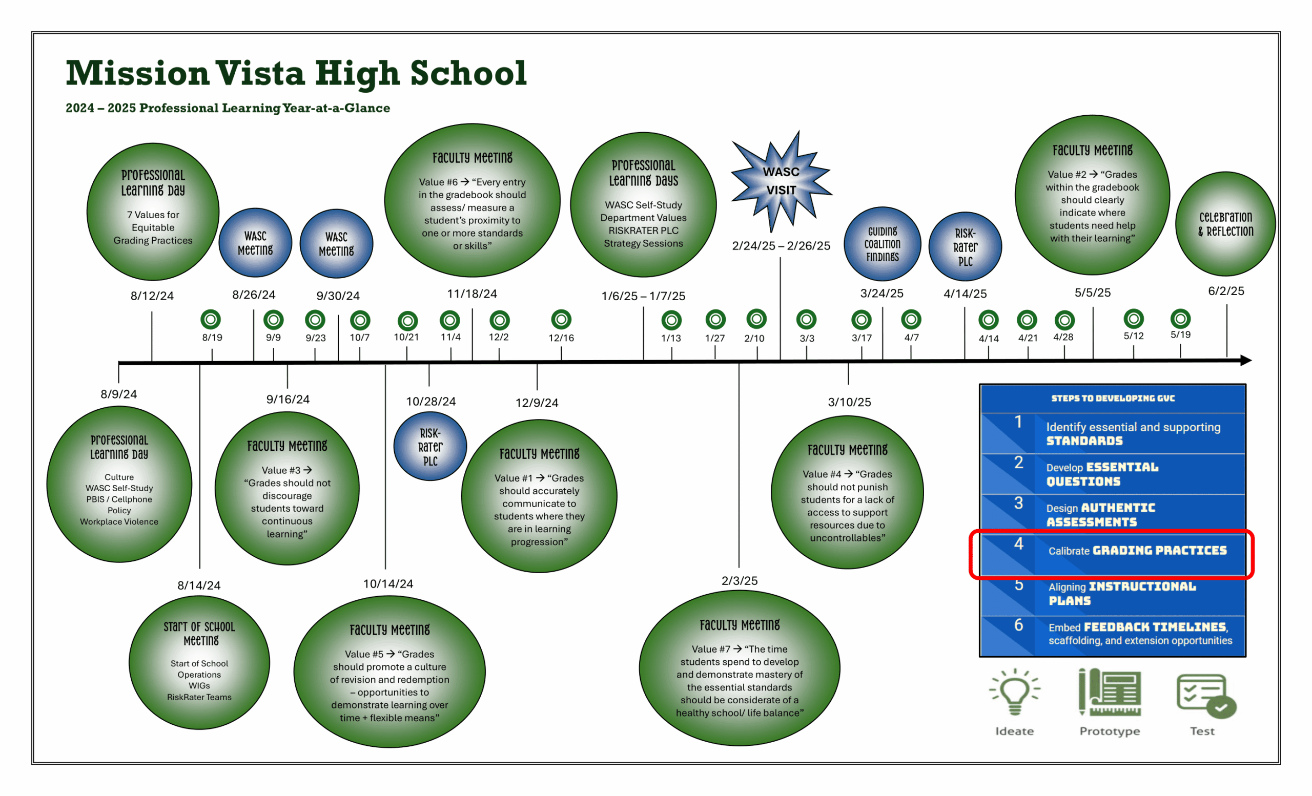 Mission Vista High School designed a visually engaging Professional Learning Calendar that clearly maps out their learning journey for the school year. Each small circle represents a PLC meeting, while the Faculty Meeting topics are intentionally aligned with the schools’ goal for the year– developing equitable grading practices. This thoughtful design ensures that professional learning is purposeful, cohesive and directly connected to improving student outcomes.