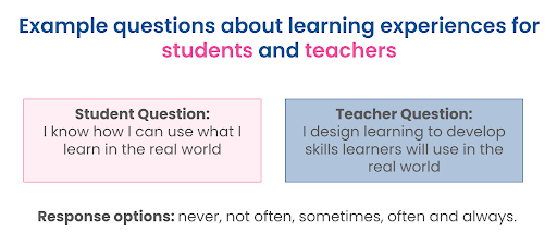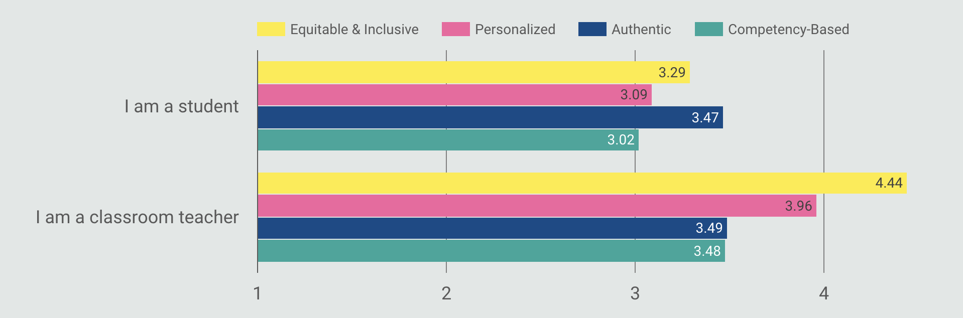 - Learner-Centered Learning Experiences: Considers student and teacher perception of the classroom community and whether their learning experiences are personalized, competency-based and authentic