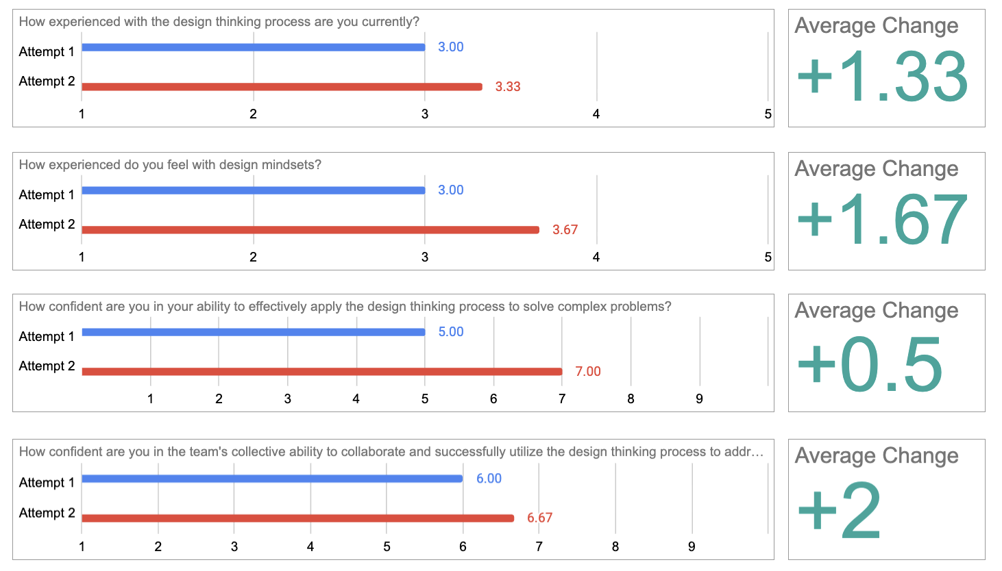 Using a simple four-question survey, participants in the Design Lab identified their level of experience with design thinking processes and mindsets, as well as their confidence in applying those to solve complex problems at the very start of the initiative.