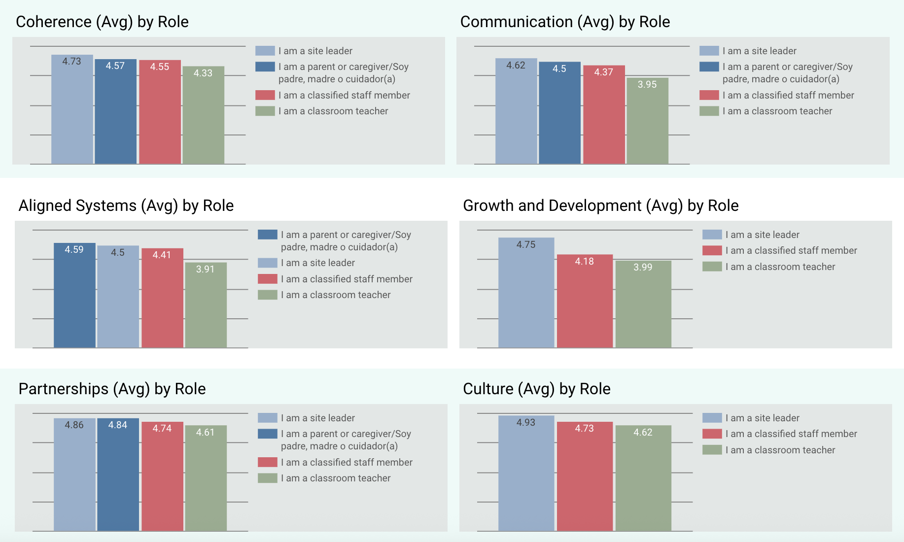 To make data from these surveys visible to districts, Learner-Centered Collaborative provides a comprehensive dashboard for leaders. The dashboard supports districts to unpack data across these items, filtering for different audiences, school sites, grade levels and more. In addition to aggregated data, leaders can drill down to specific questions and analyze how different audiences responded.