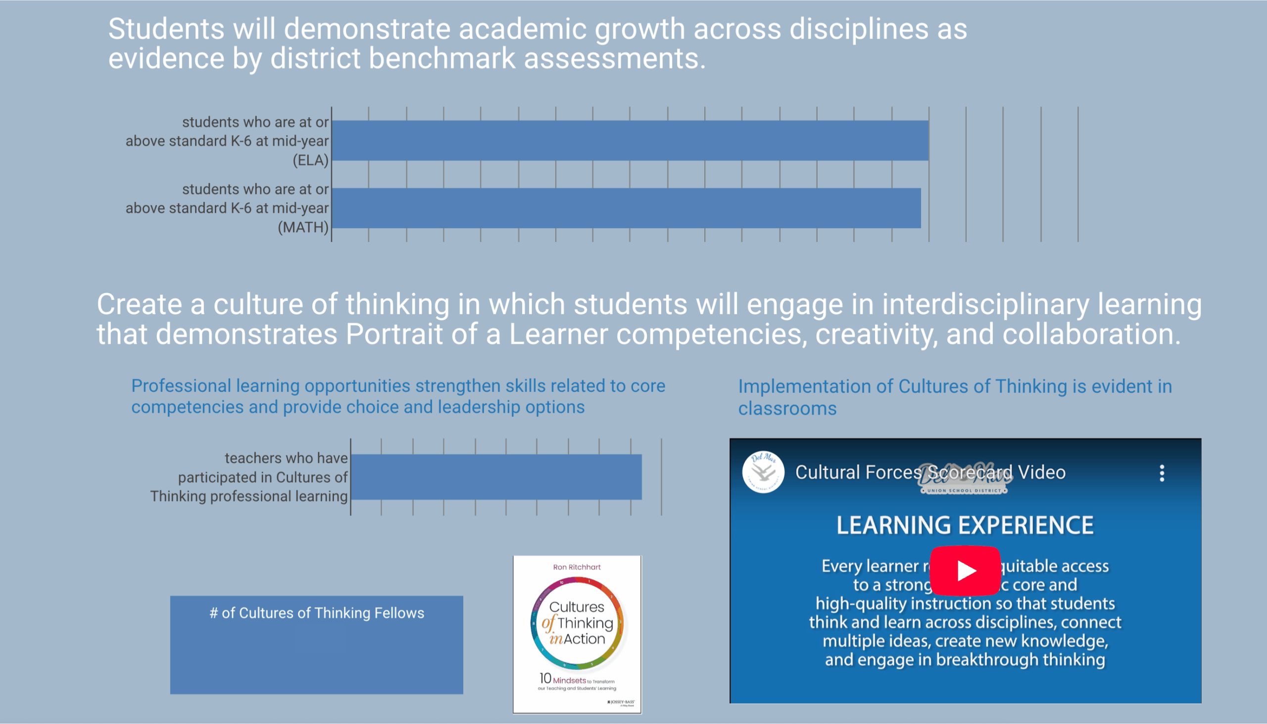 In Del Mar, one of their outcomes focuses on learning experiences: “Every learner receives equitable access to a strong academic core and high-quality instruction so that students think and learn across disciplines, connect multiple ideas, create new knowledge, and engage in breakthrough thinking.” To track their progress toward this outcome, they are measuring district benchmark assessments in ELA and mathematics as well as educator engagement in professional learning opportunities.