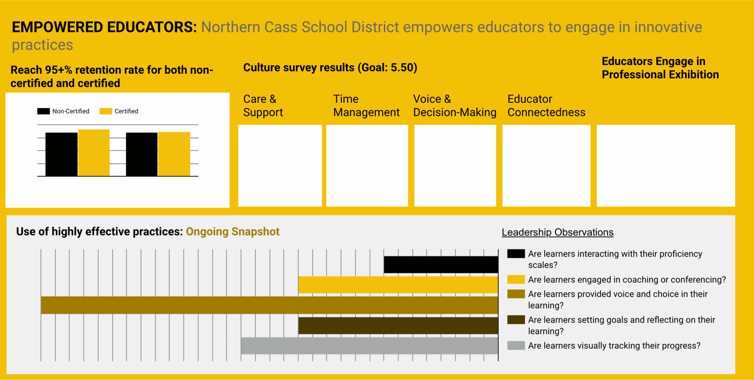 In Northern Cass, one of their outcomes includes “empowering educators to engage in innovative practices.” To measure progress toward that outcome, they are tracking educator retention and participation in professional exhibitions, conducting culture surveys, and looking for five specific bright spots within classroom settings.